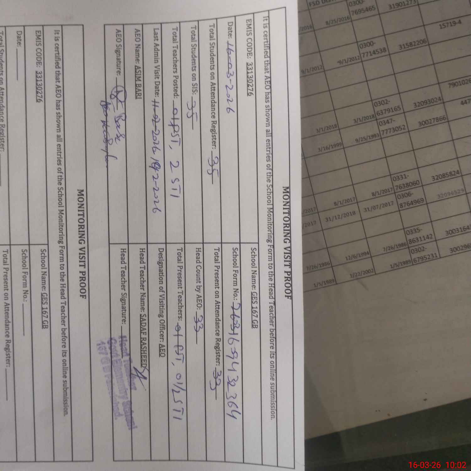 | EMIS Code: 33130276 | Name of School: GES CHAK NO.167/GB | |||