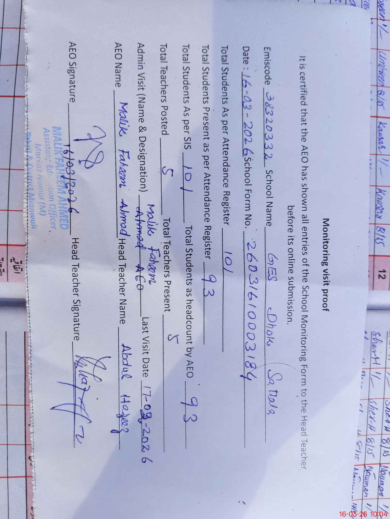 | Attendance Register | Head Teacher | MEA with School | Visit Proof |