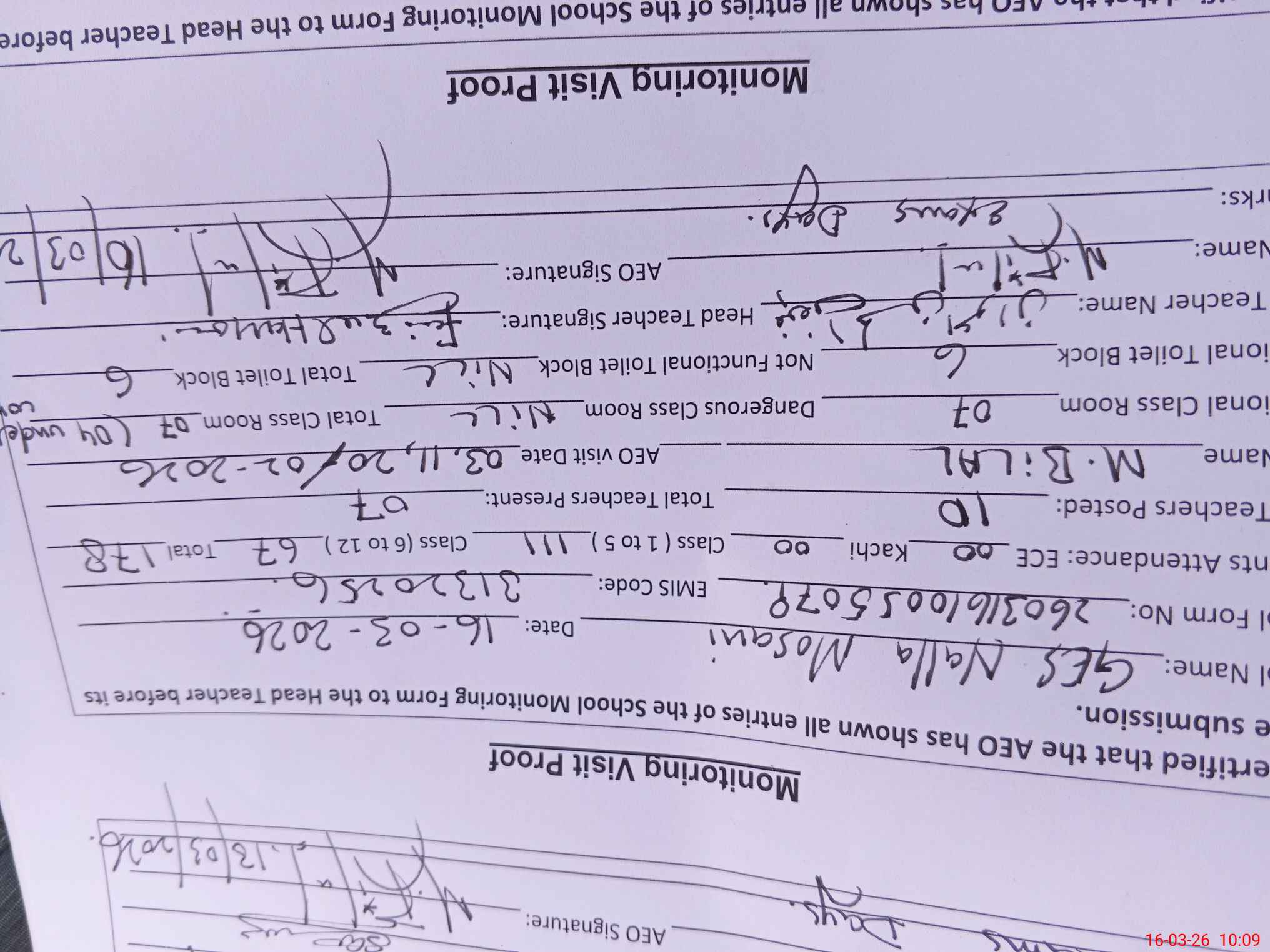 | Certified that this School was Inspected by the Undersigned MEA/DMO Today and the Information Stated Above is as Per Record. | |||||