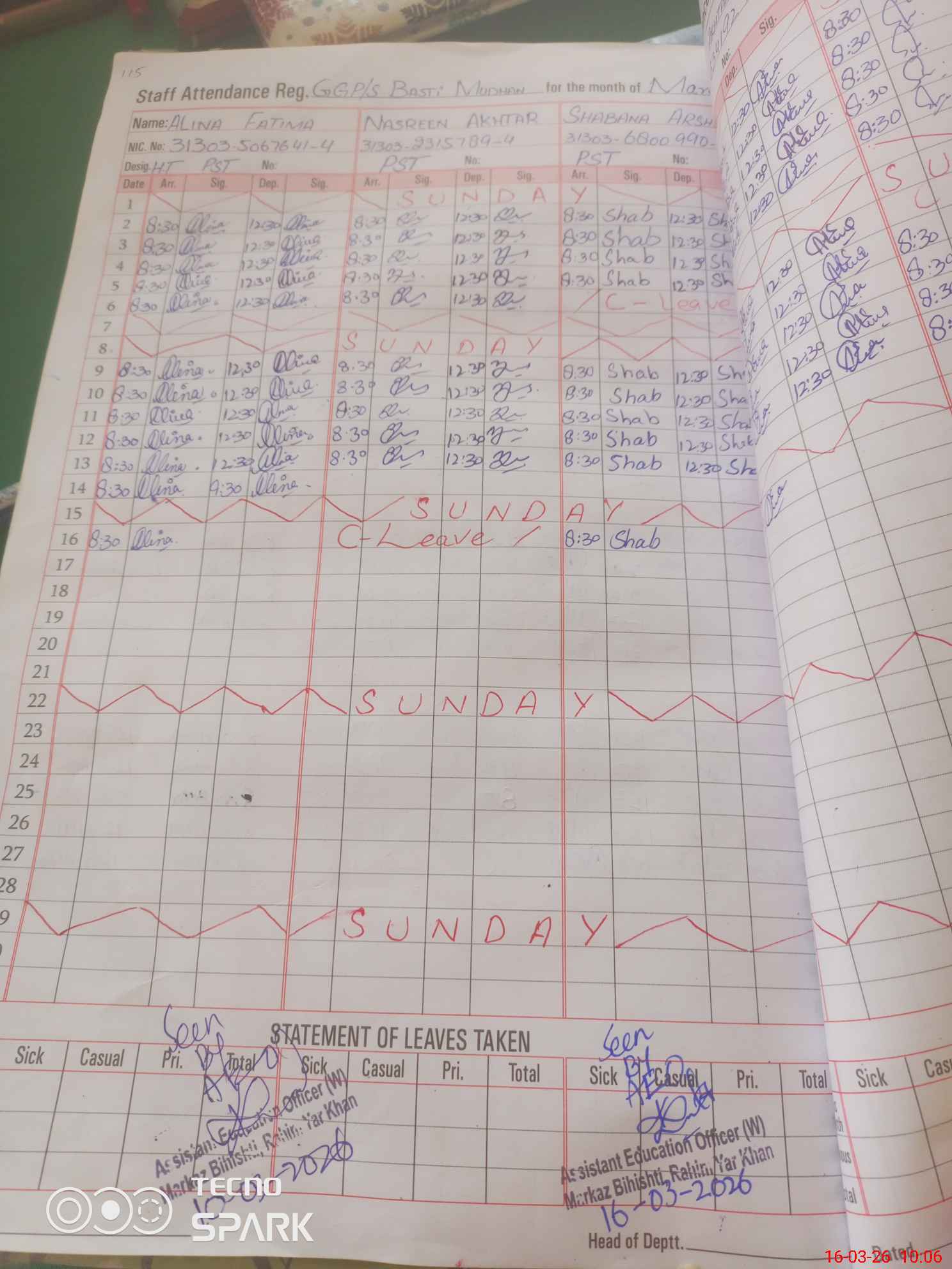 | CNIC | Full Name | Designation | R/C | Absence During Last Calender Month |