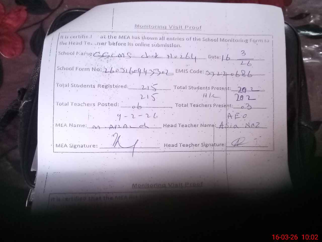 | Certified that this School was Inspected by the Undersigned MEA/DMO Today and the Information Stated Above is as Per Record. | |||||