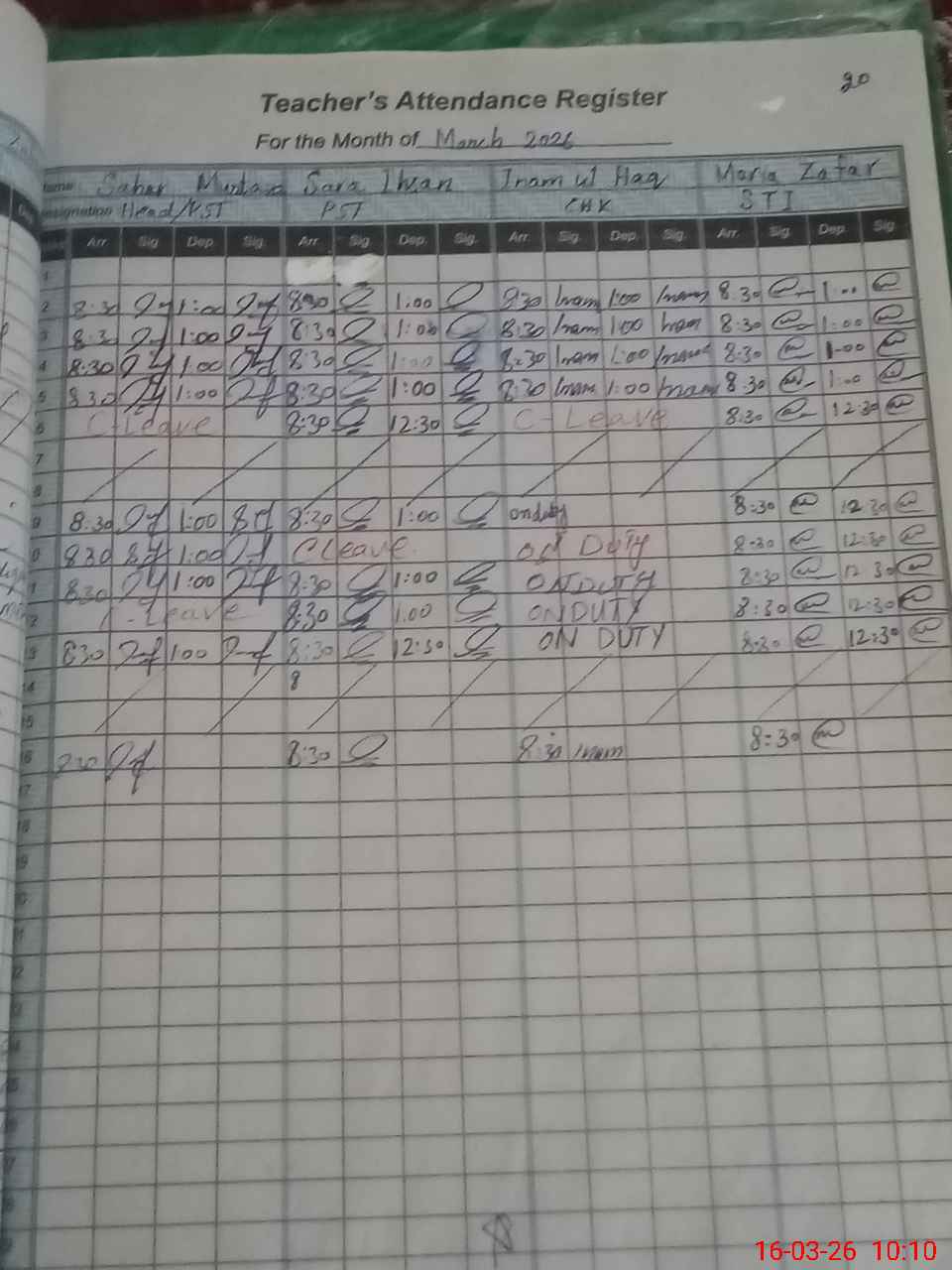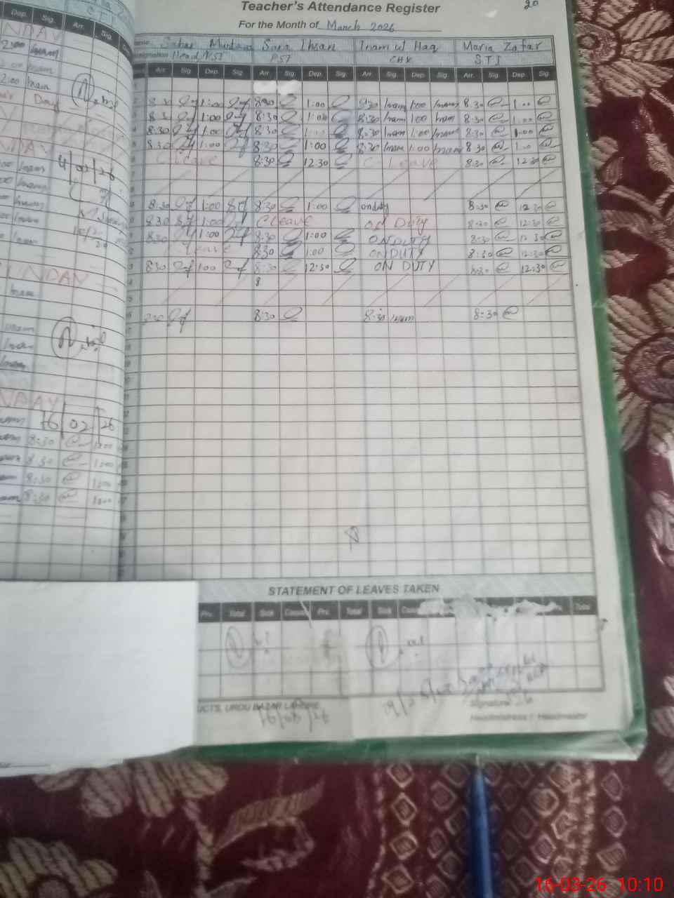 | Leave | Duty | Absent | Maternity | Medical | Ex- Pak |