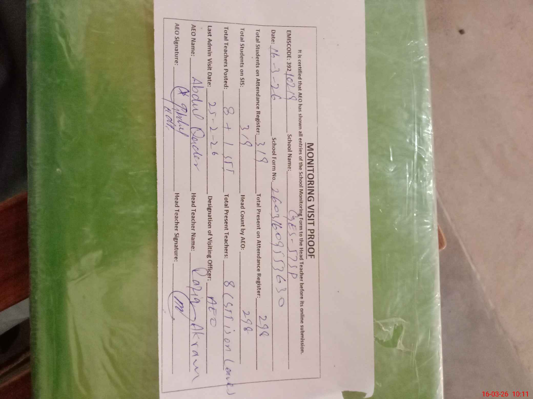 | Attendance Register | Head Teacher | MEA with School | Visit Proof |