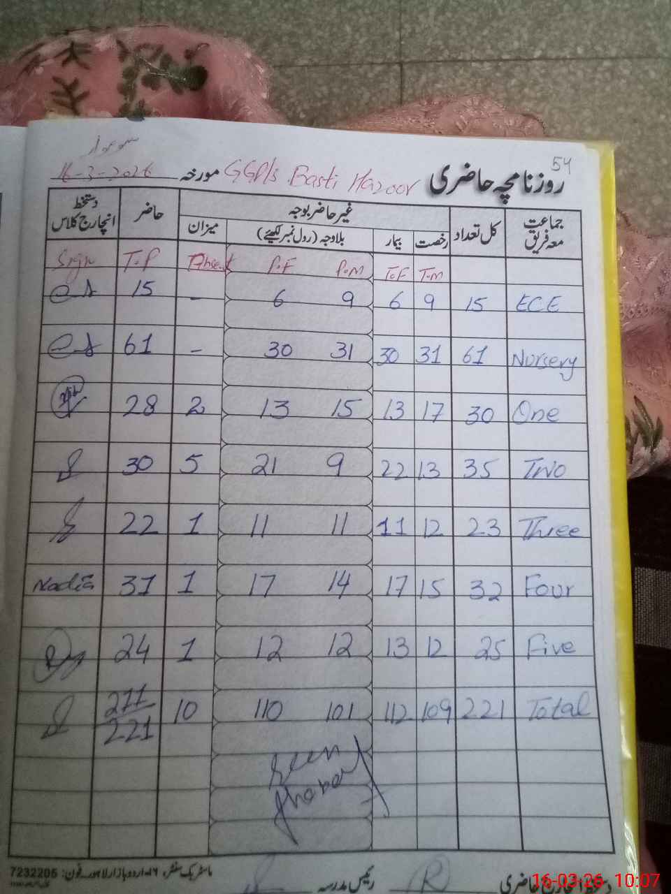 | No. of Students Present - Male | 0 | 9 | 15 | 9 | 11 | 14 | 12 | 101 | ||||||||