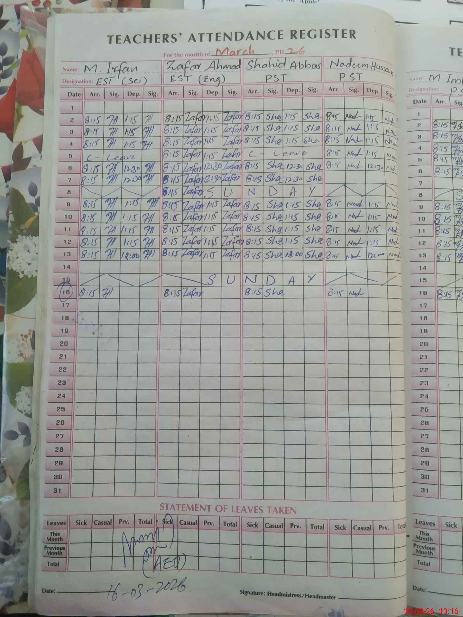 | Leave | Duty | Absent | Maternity | Medical | Ex- Pak |