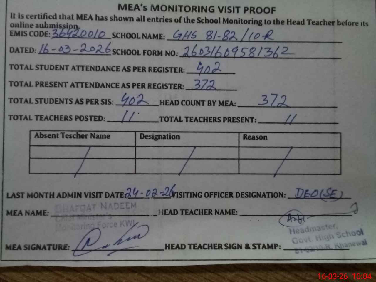 | EMIS Code: 36420010 | Name of School: GHS 81-82/10-R, KHANEWAL | |||