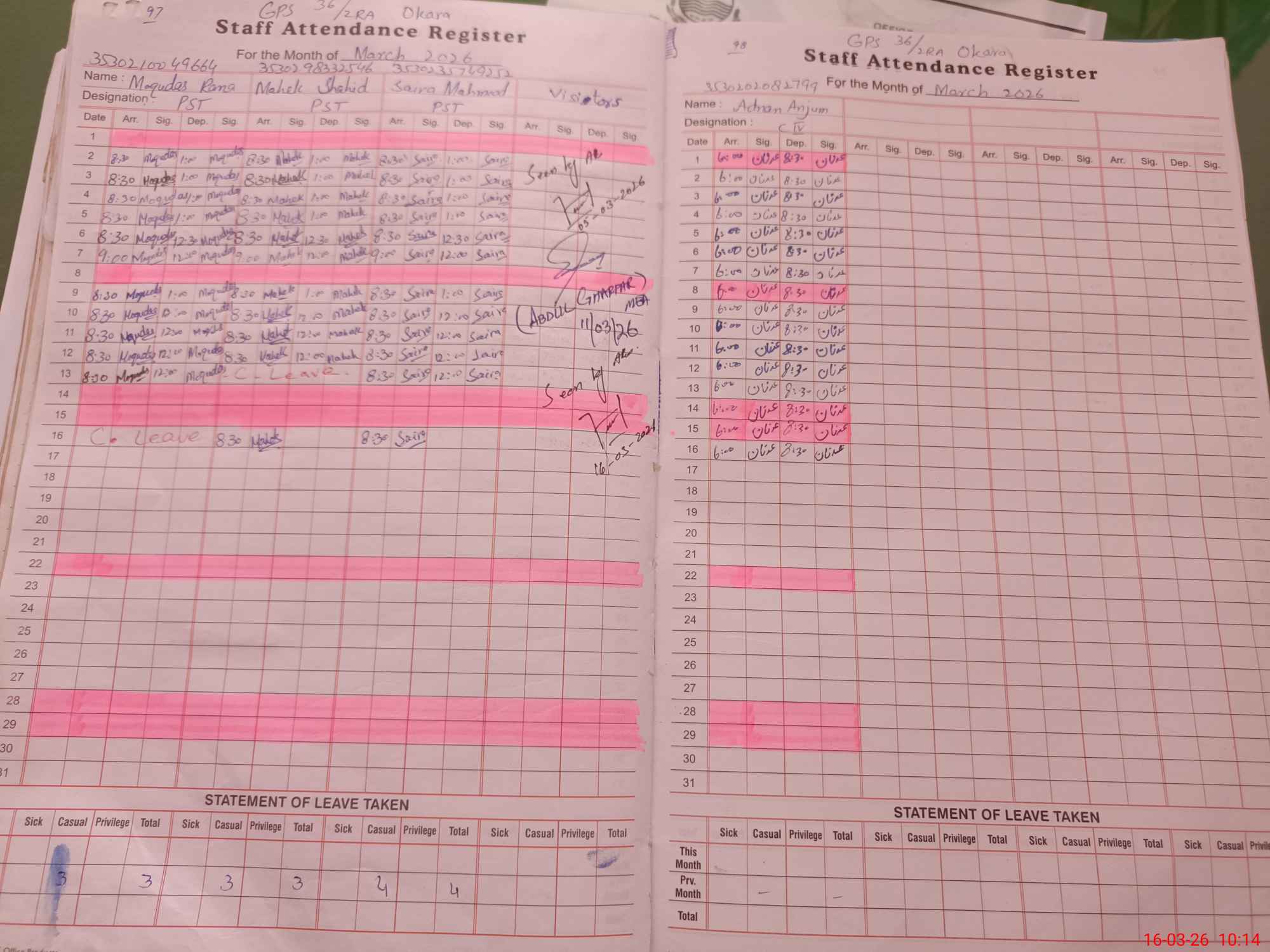 | CNIC | Full Name | Designation | R/C | Absence During Last Calender Month |