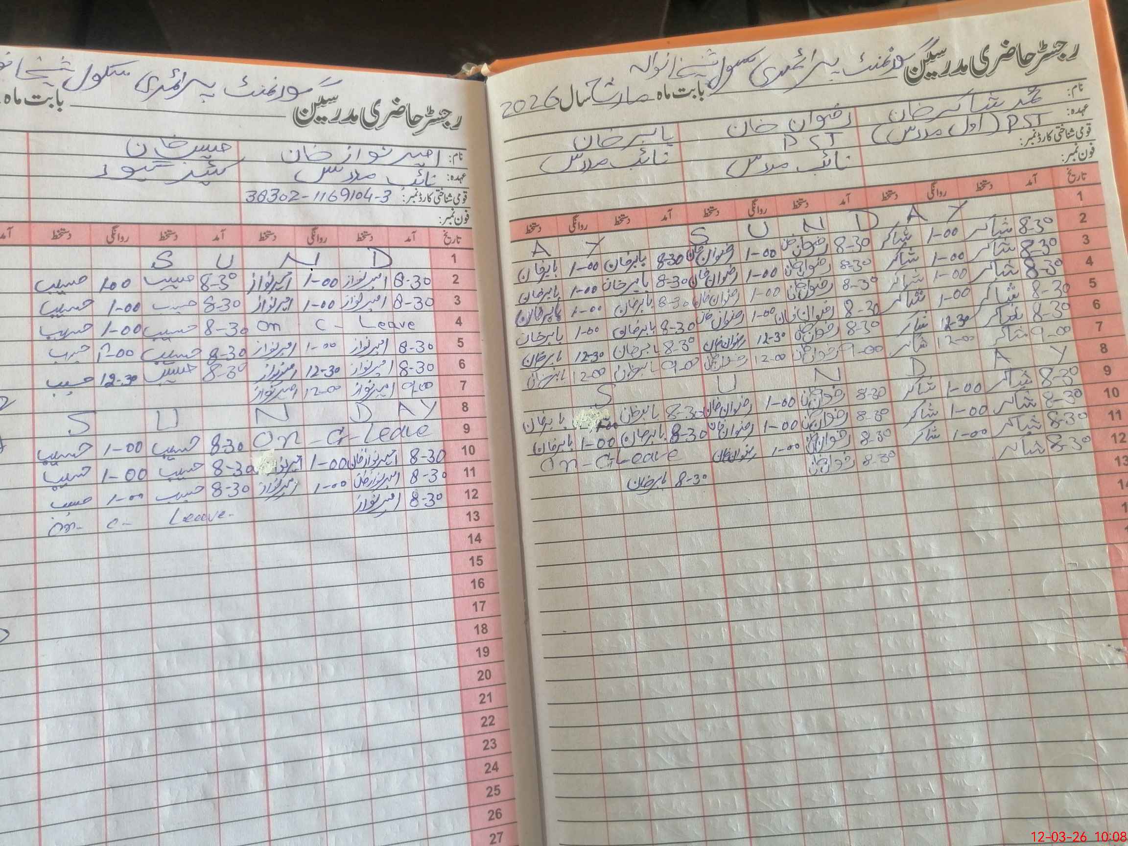 | CNIC | Full Name | Designation | R/C | Absence During Last Calender Month |