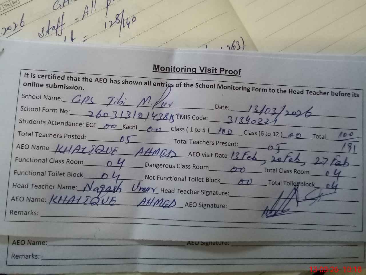 | Attendance Register | Head Teacher | MEA with School | Visit Proof |