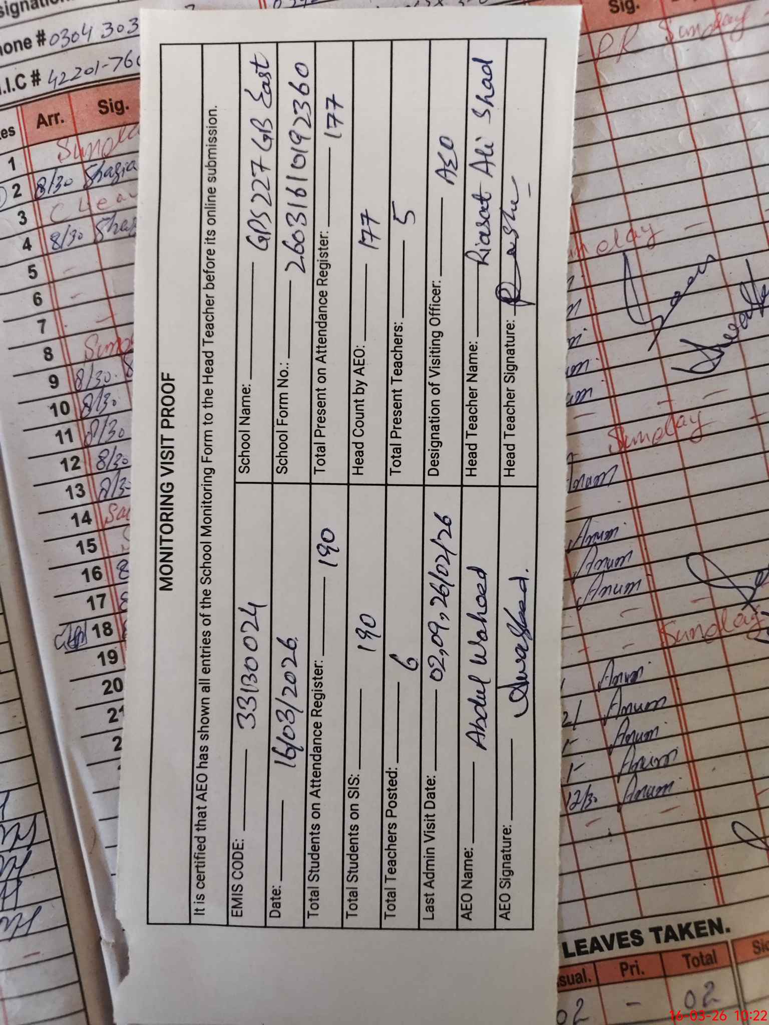 | Attendance Register | Head Teacher | MEA with School | Visit Proof |