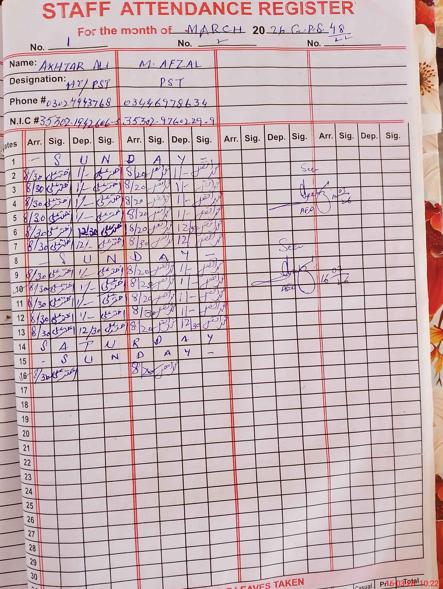 | Name: Ak**** Al**** Designation: (School Headmaster's/Headmistress's) PST Phone/Cell Number: 03**** |