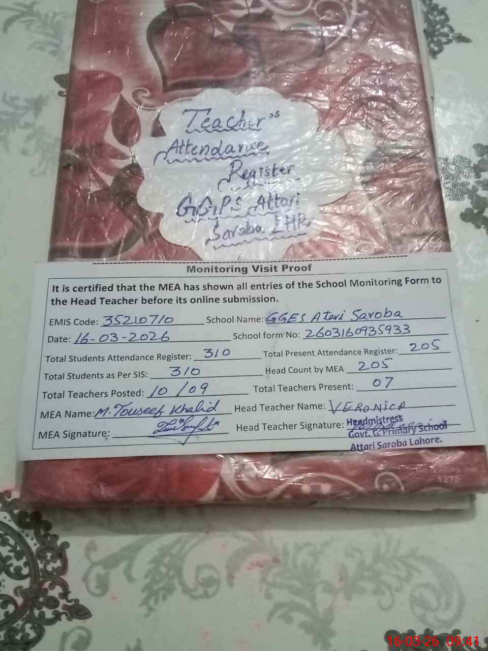 | Attendance Register | Head Teacher | MEA with School | Visit Proof |