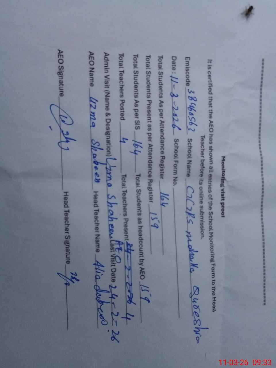 | Certified that this School was Inspected by the Undersigned MEA/DMO Today and the Information Stated Above is as Per Record. | |||||