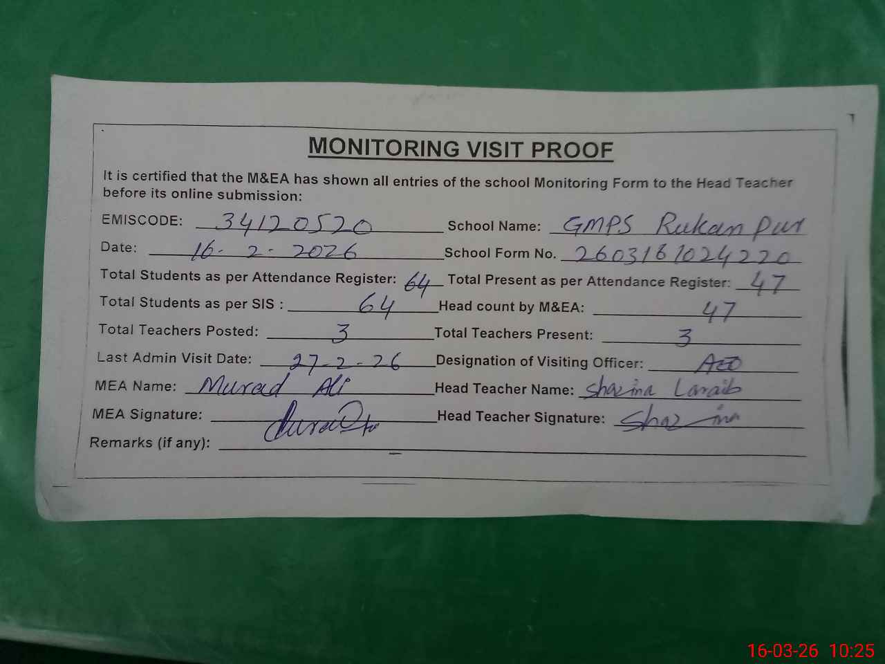 | Certified that this School was Inspected by the Undersigned MEA/DMO Today and the Information Stated Above is as Per Record. | |||||