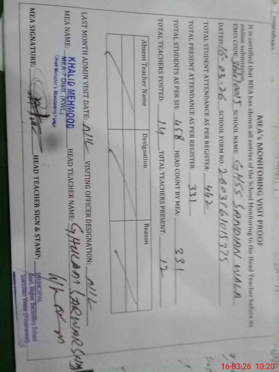 | Attendance Register | Head Teacher | MEA with School | Visit Proof |