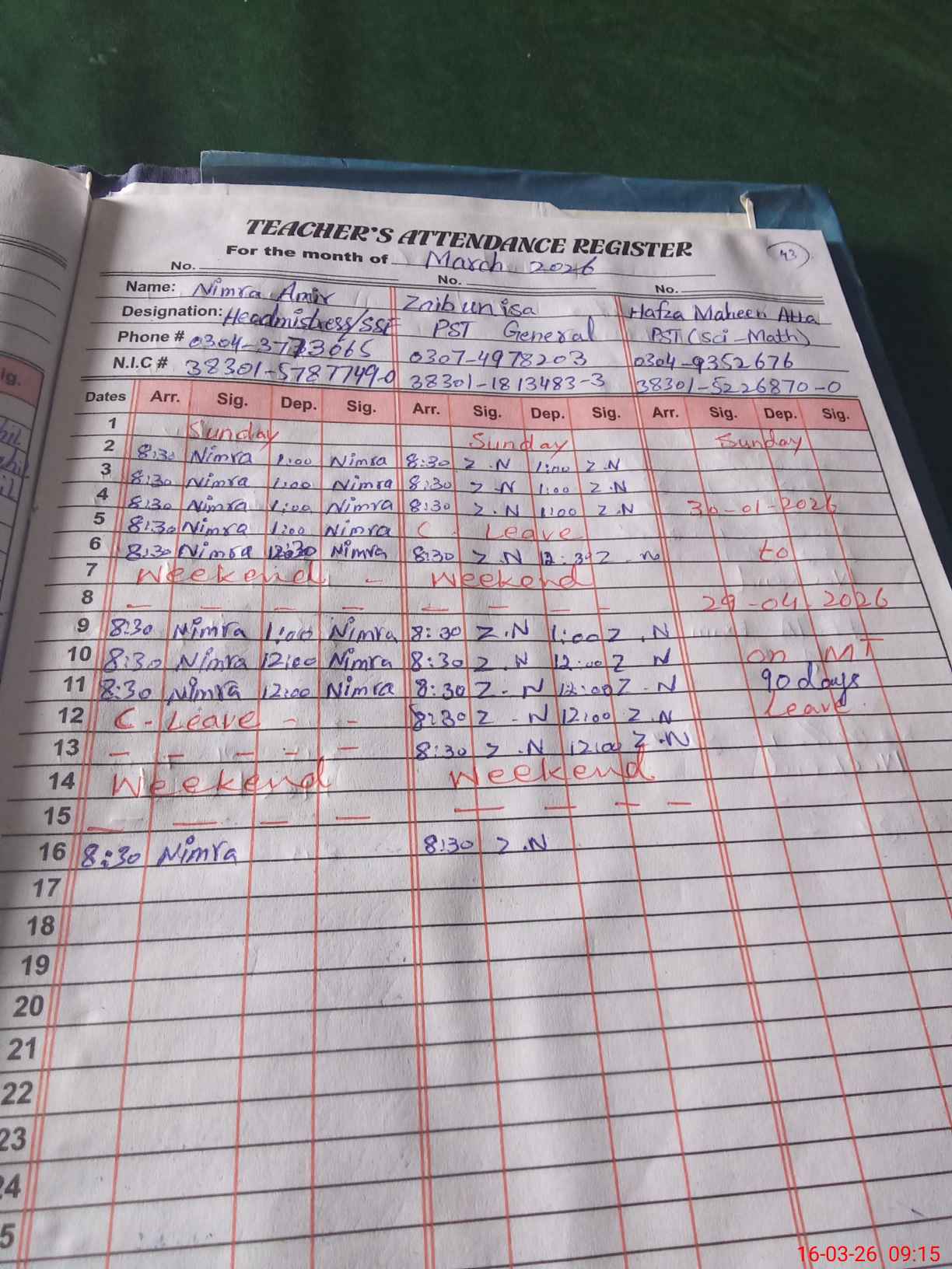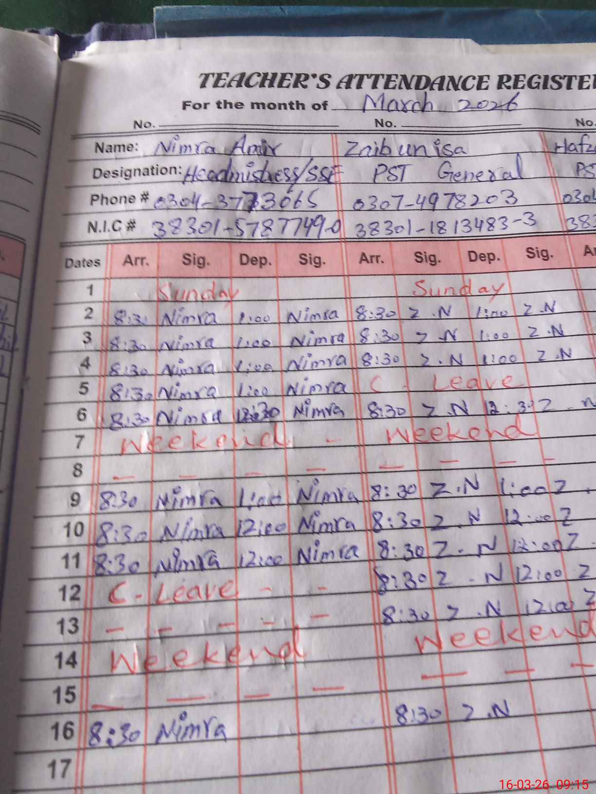 | CNIC | Full Name | Designation | R/C | Absence During Last Calender Month |