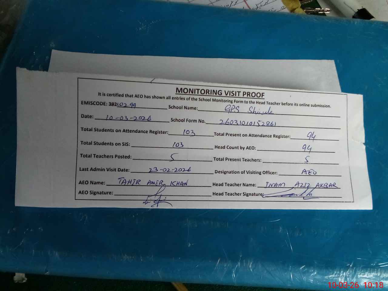 | Name: In**** Az**** Ak**** Designation: (School Headmaster's/Headmistress's) PST Phone/Cell Number: 03**** |