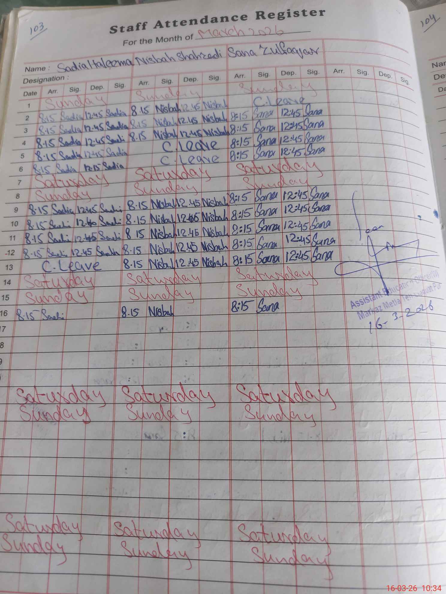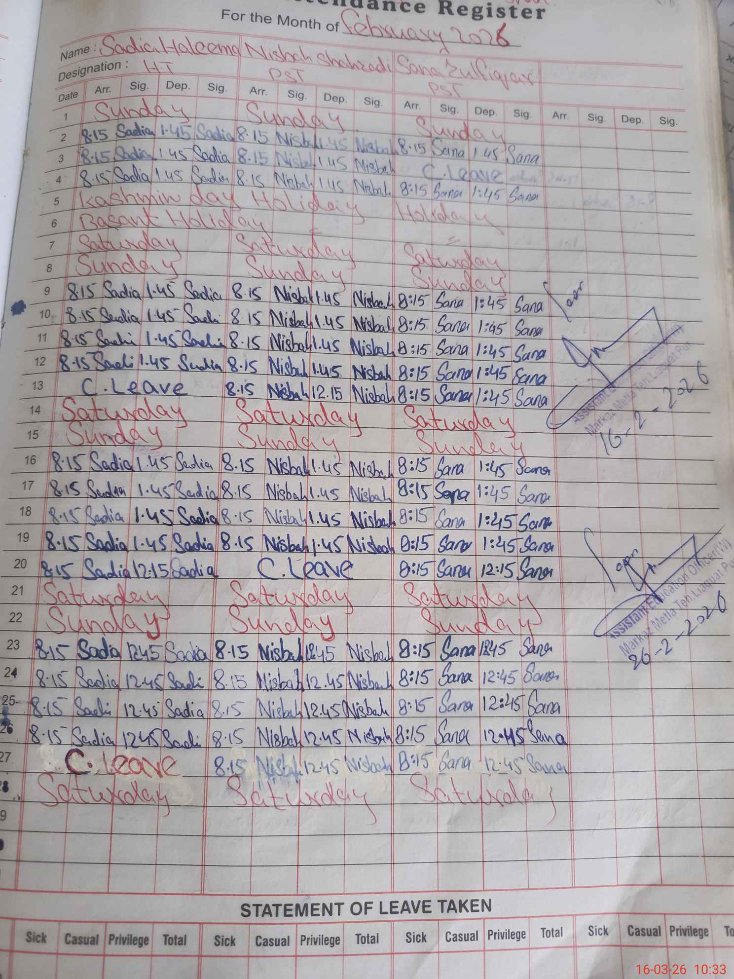 | Leave | Duty | Absent | Maternity | Medical | Ex- Pak |