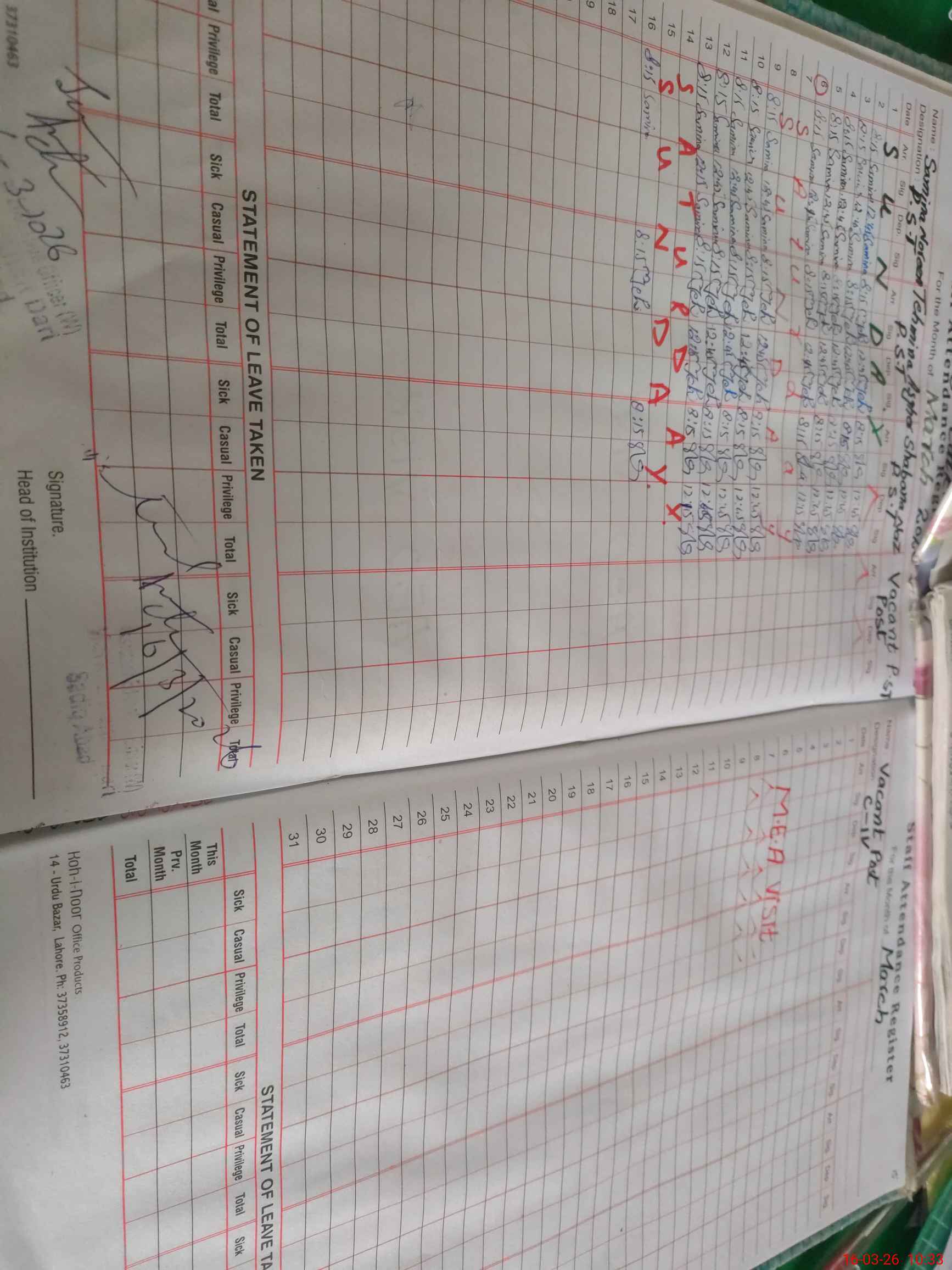 | Leave | Duty | Absent | Maternity | Medical | Ex- Pak |