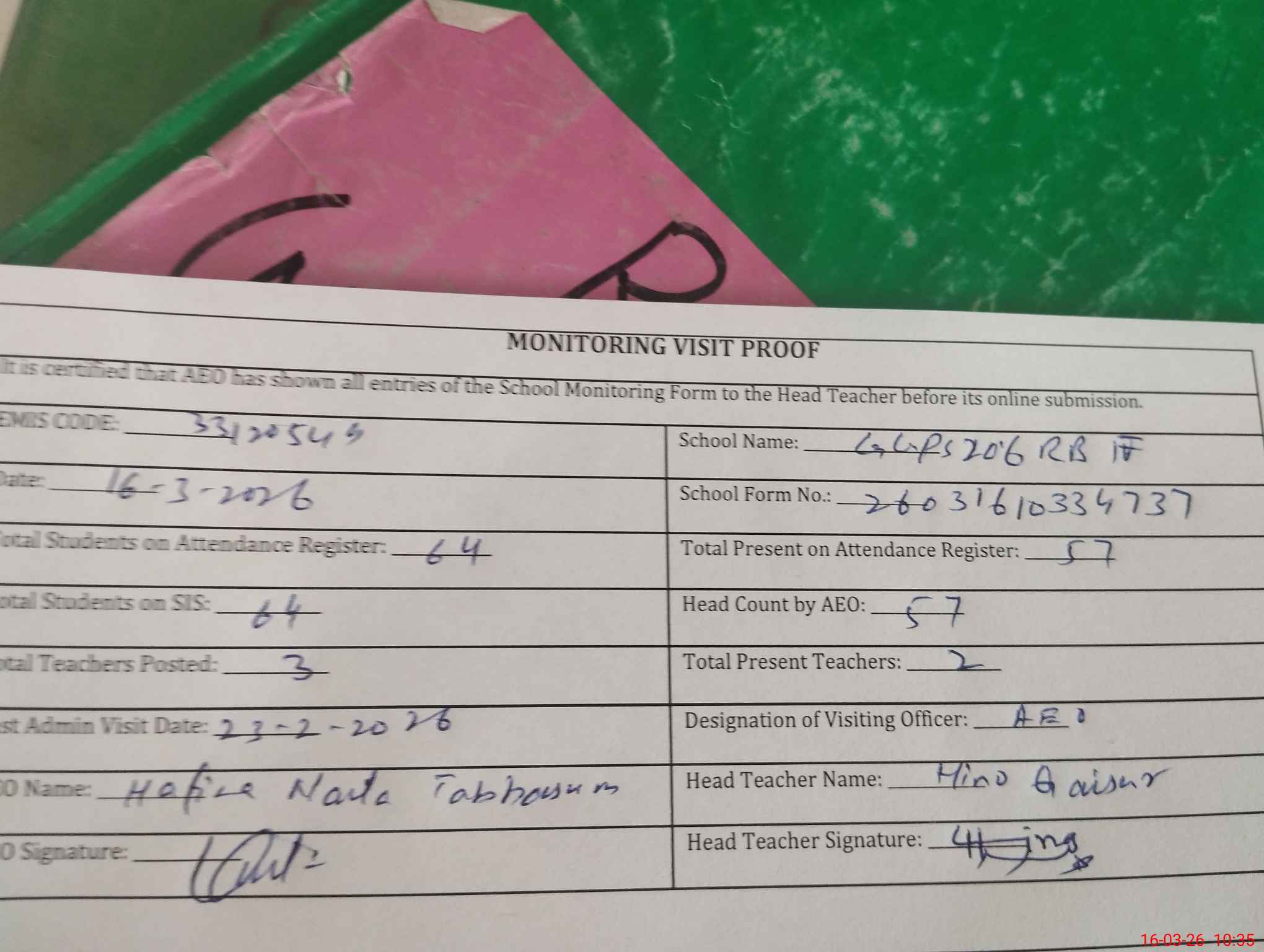 | Attendance Register | Head Teacher | MEA with School | Visit Proof |