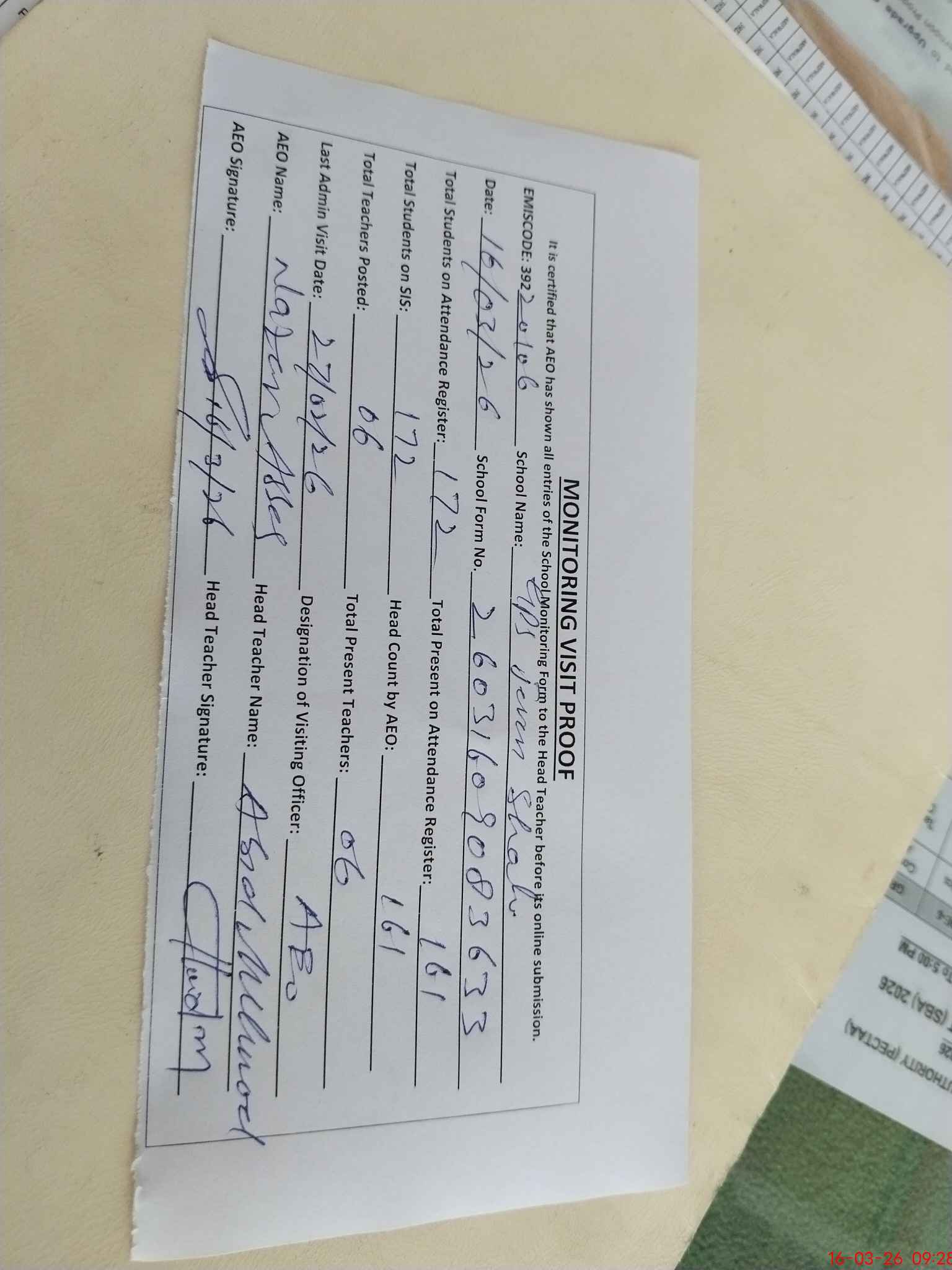 | Certified that this School was Inspected by the Undersigned MEA/DMO Today and the Information Stated Above is as Per Record. | |||||