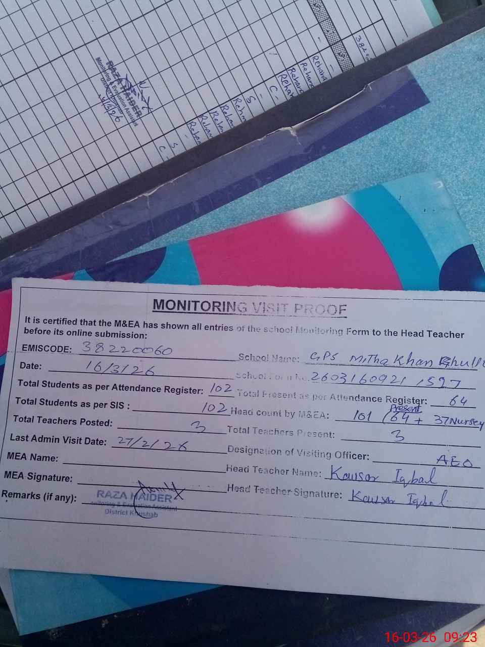 | Attendance Register | Head Teacher | MEA with School | Visit Proof |