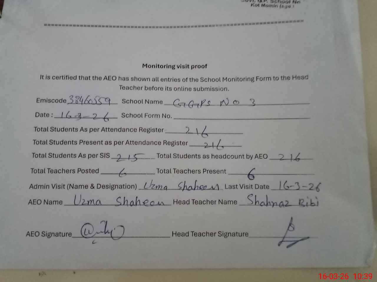| EMIS Code: 38460559 | Name of School: GGPS NO. 3 KOT MOMIN | |||