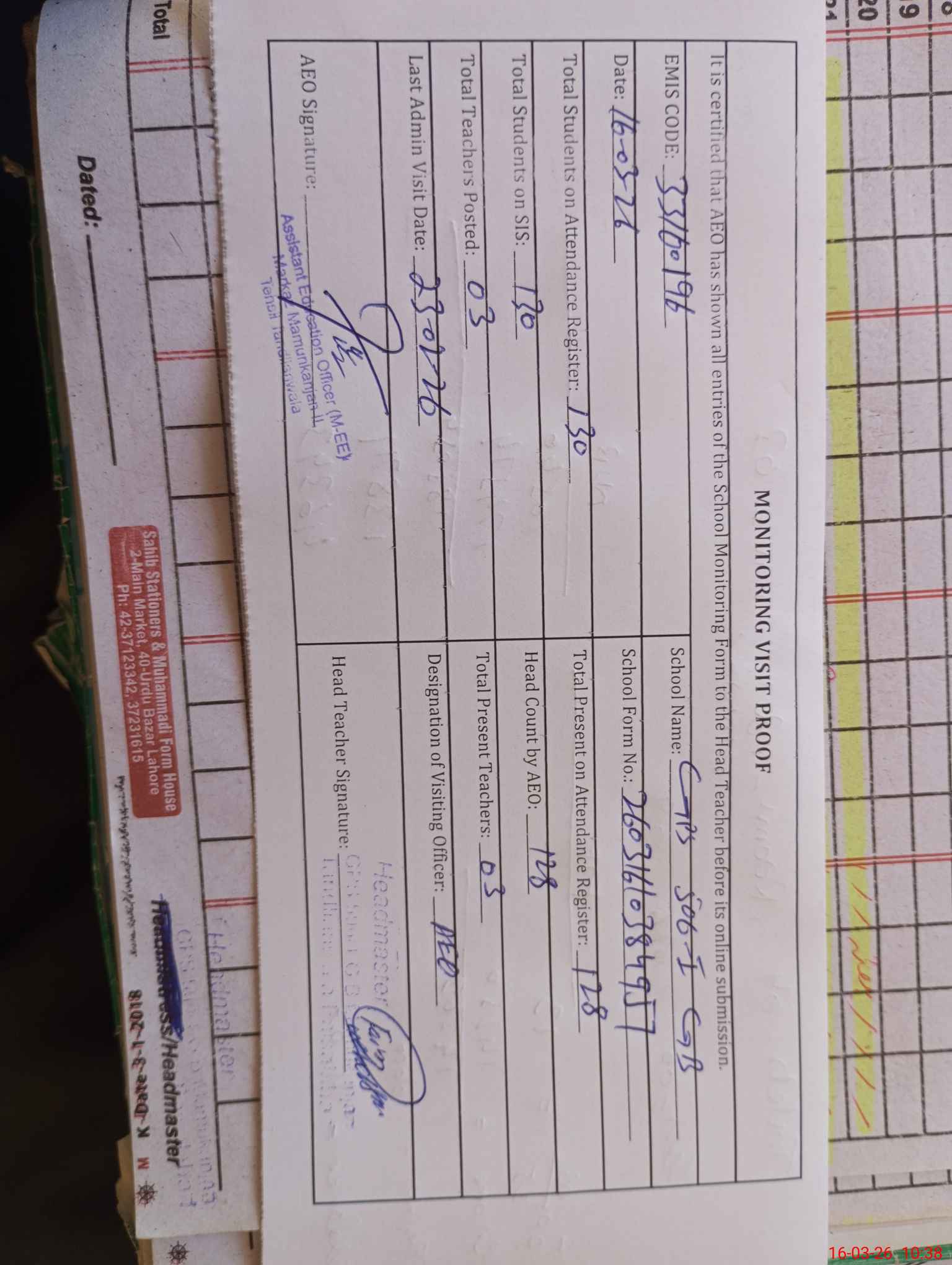 | Attendance Register | Head Teacher | MEA with School | Visit Proof |