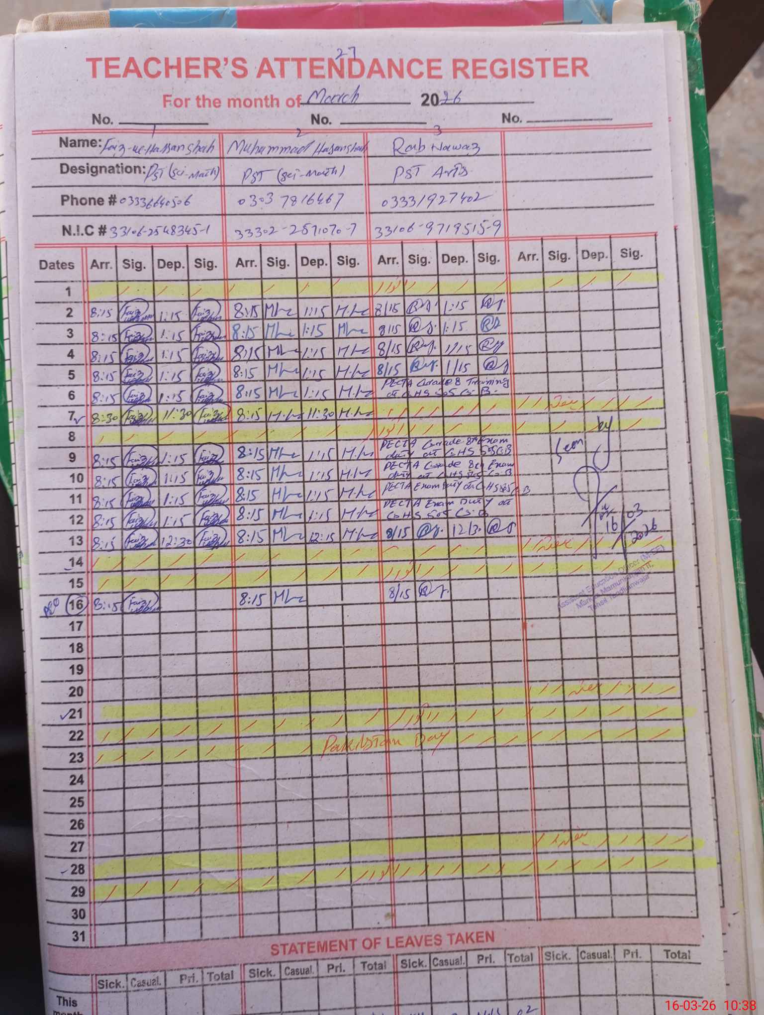 | Name: FA**** ULHA**** Designation: (School Headmaster's/Headmistress's) PST Phone/Cell Number: 03**** |