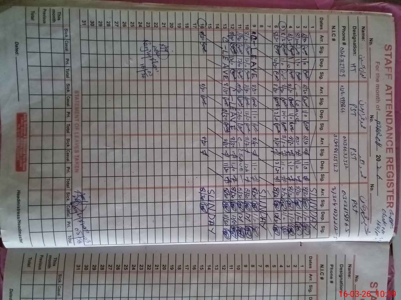 | Name: No**** Hu**** Designation: (School Headmaster's/Headmistress's) PST Phone/Cell Number: 03**** |