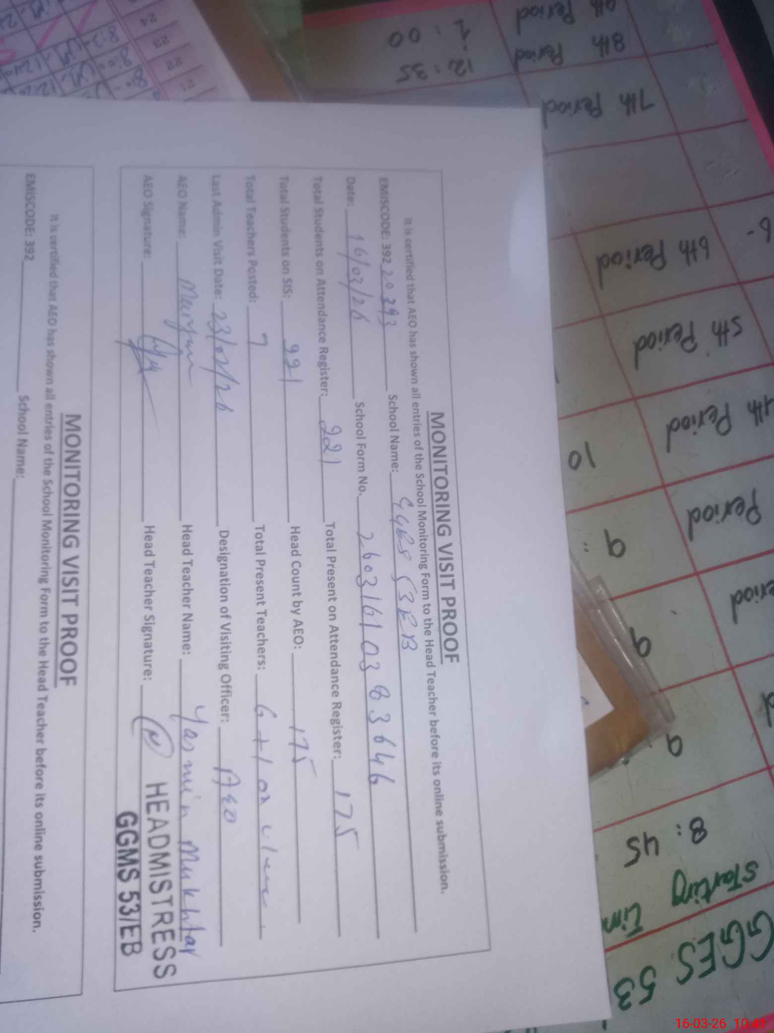 | Attendance Register | Head Teacher | MEA with School | Visit Proof |