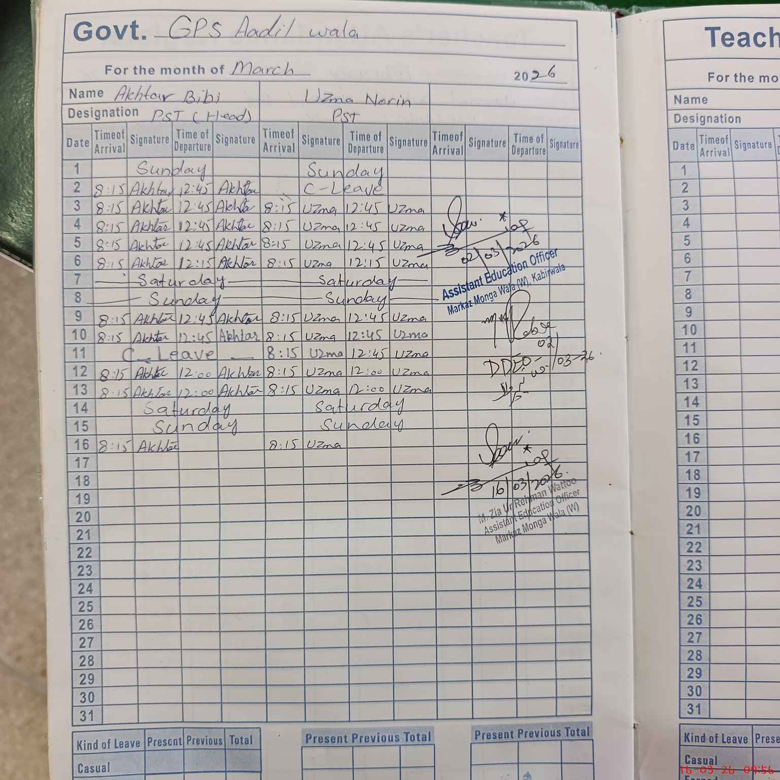 | Name: Ak**** Bi**** Designation: (School Headmaster's/Headmistress's) PST Phone/Cell Number: 03**** |