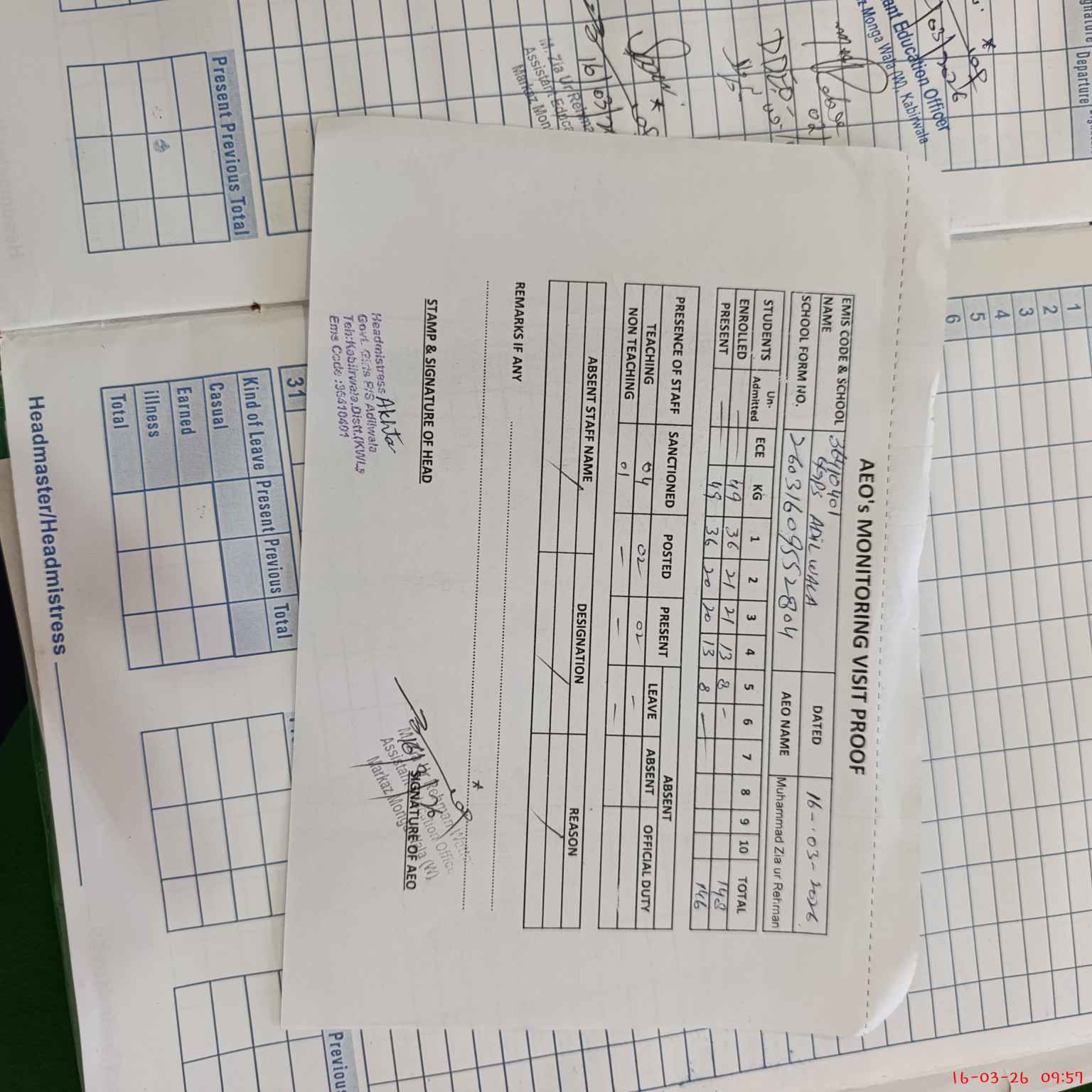 | Attendance Register | Head Teacher | MEA with School | Visit Proof |