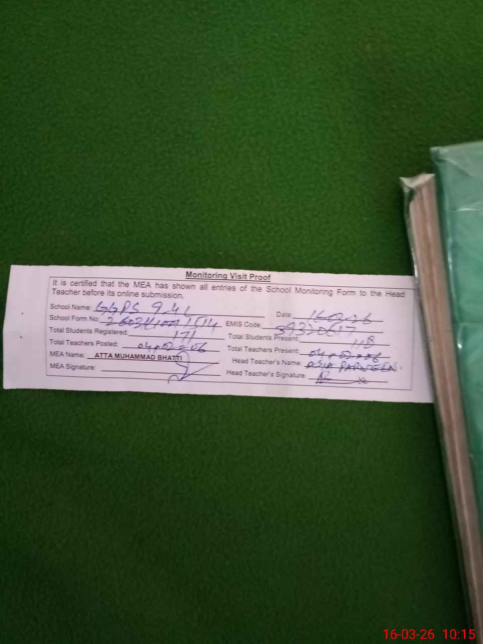 | Certified that this School was Inspected by the Undersigned MEA/DMO Today and the Information Stated Above is as Per Record. | |||||
