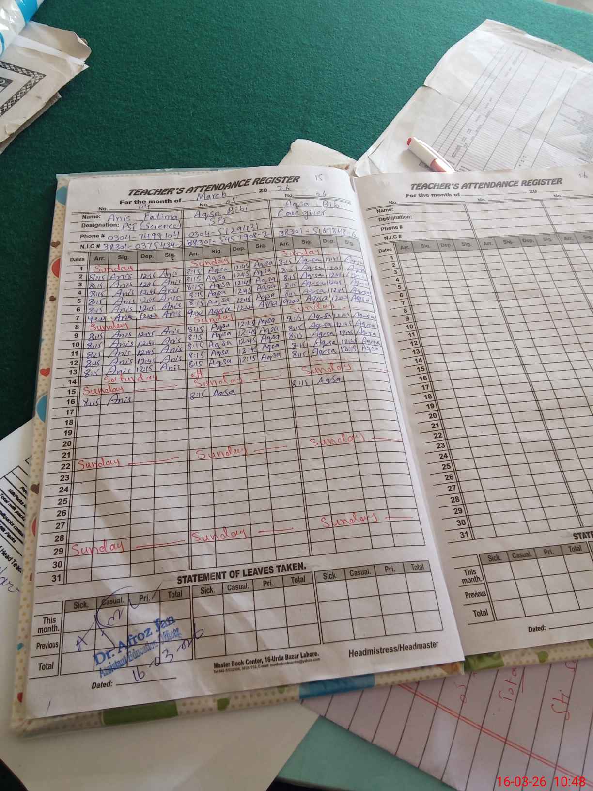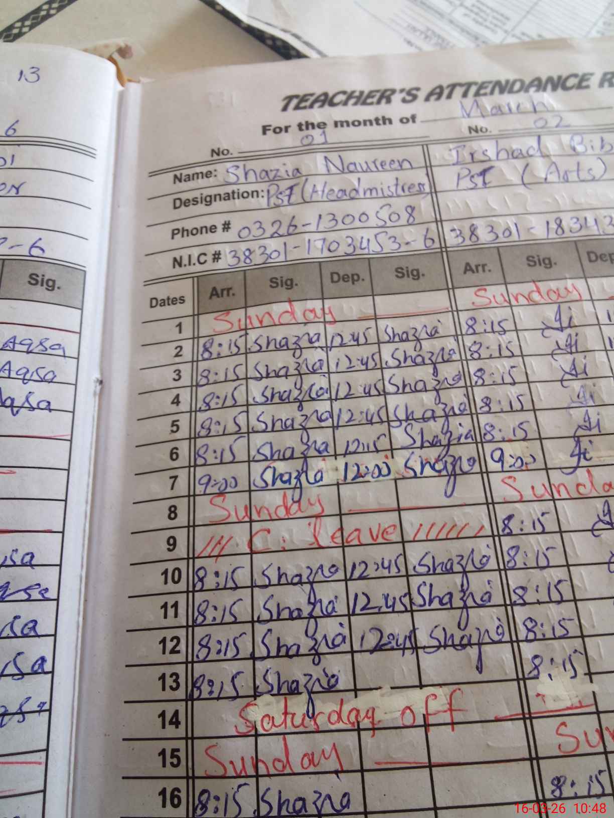 | CNIC | Full Name | Designation | R/C | Absence During Last Calender Month |