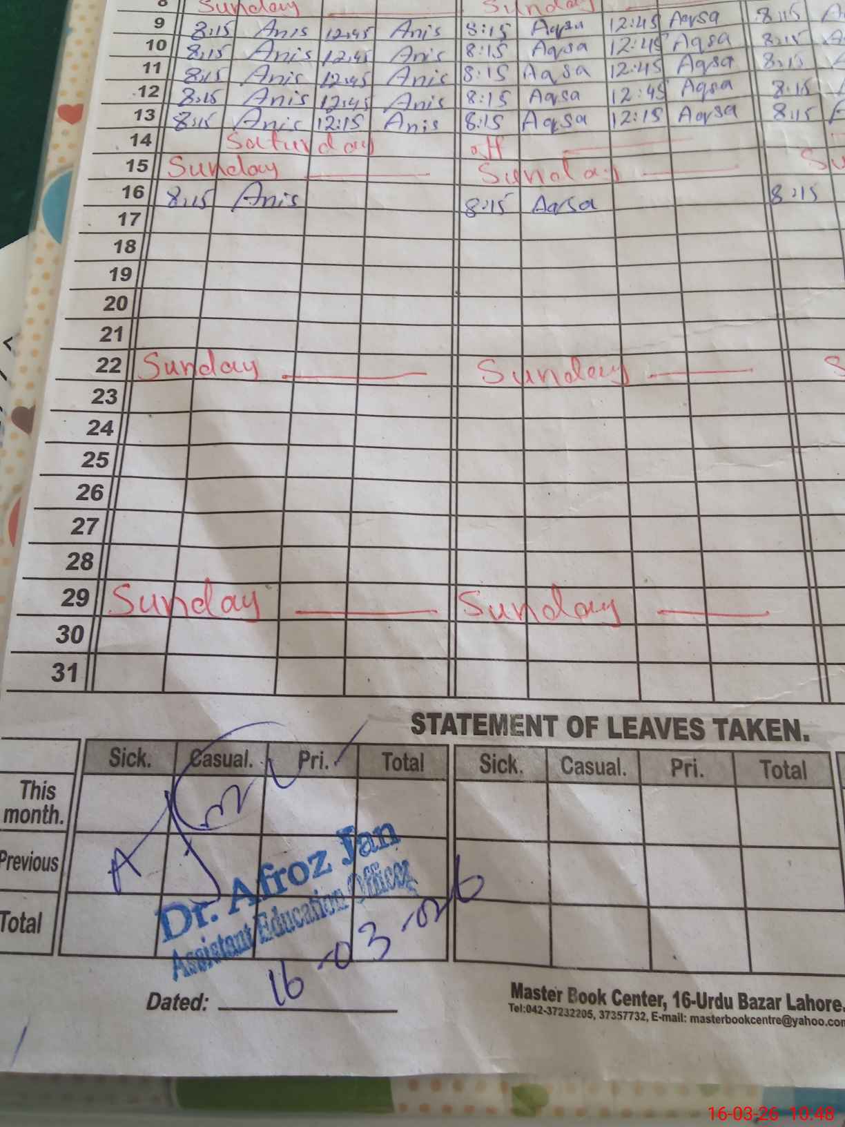 | Leave | Duty | Absent | Maternity | Medical | Ex- Pak |