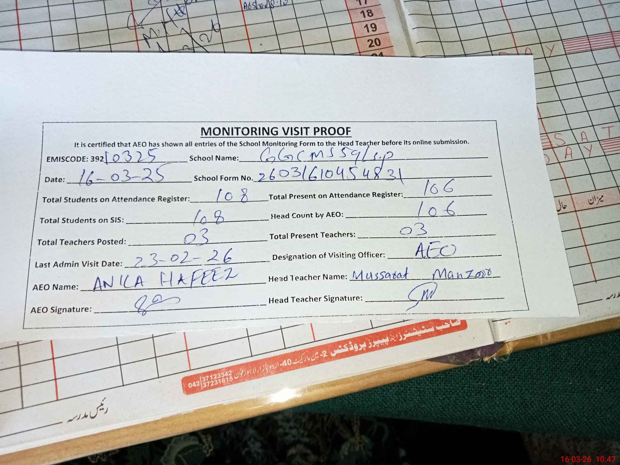 | Attendance Register | Head Teacher | MEA with School | Visit Proof |