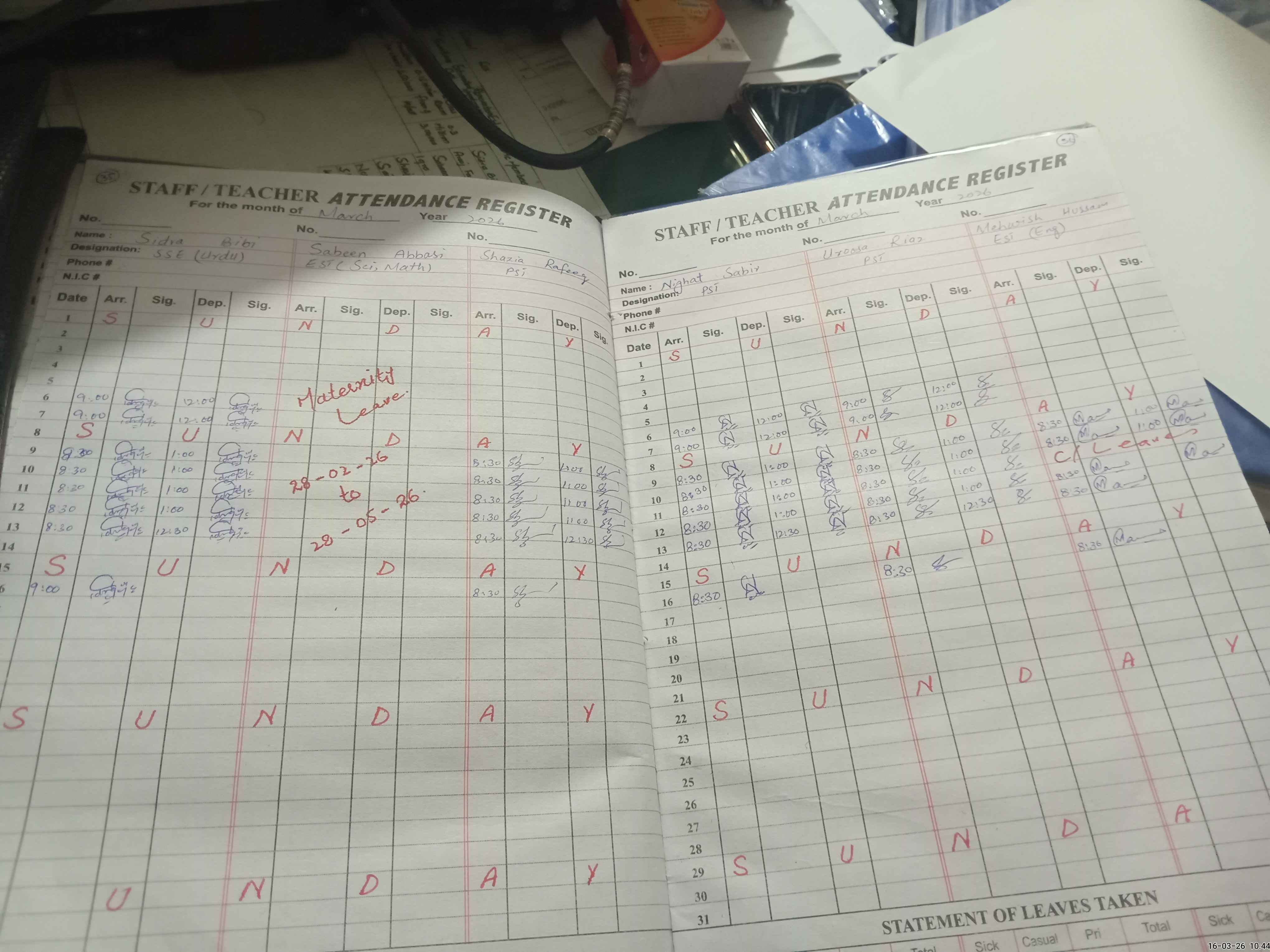 | Leave | Duty | Absent | Maternity | Medical | Ex- Pak |