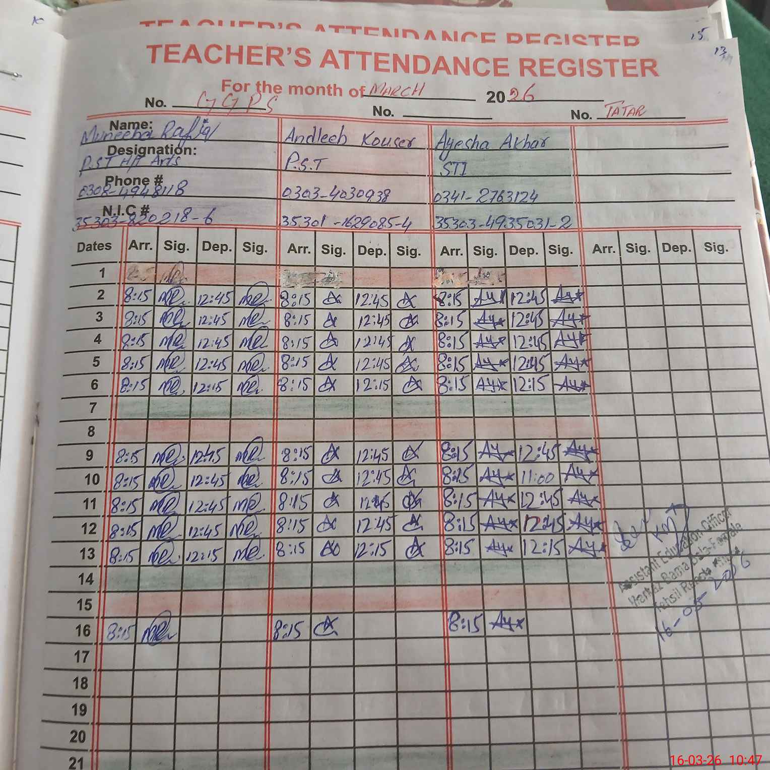 | CNIC | Full Name | Designation | R/C | Absence during last cal. month |