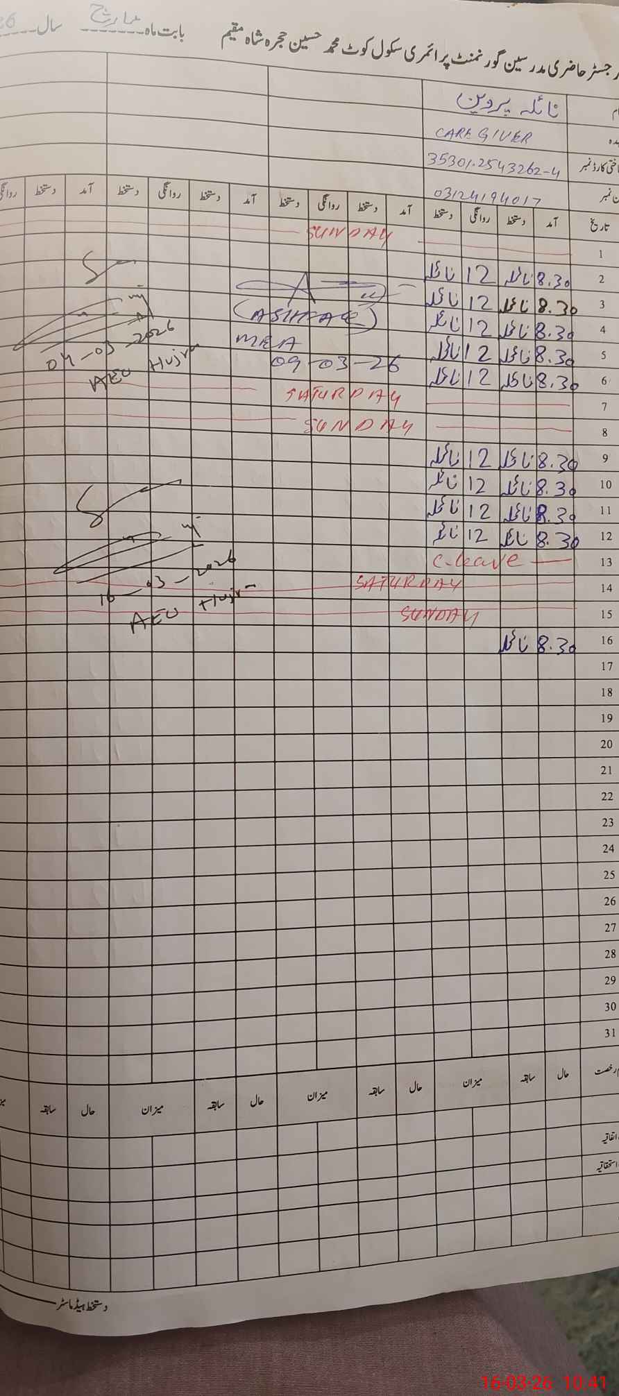 | CNIC | Full Name | Designation | R/C | Absence During Last Calender Month |