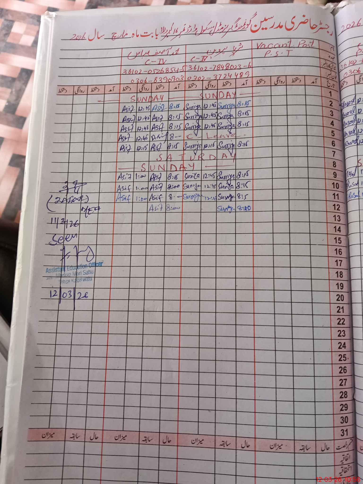 | 36**** | Ir**** Na**** | PST Science/Maths | Regular | 0 | 0 | 0 | 0 | 0 | 0 | 0 | 0 | 0 | Maternity |