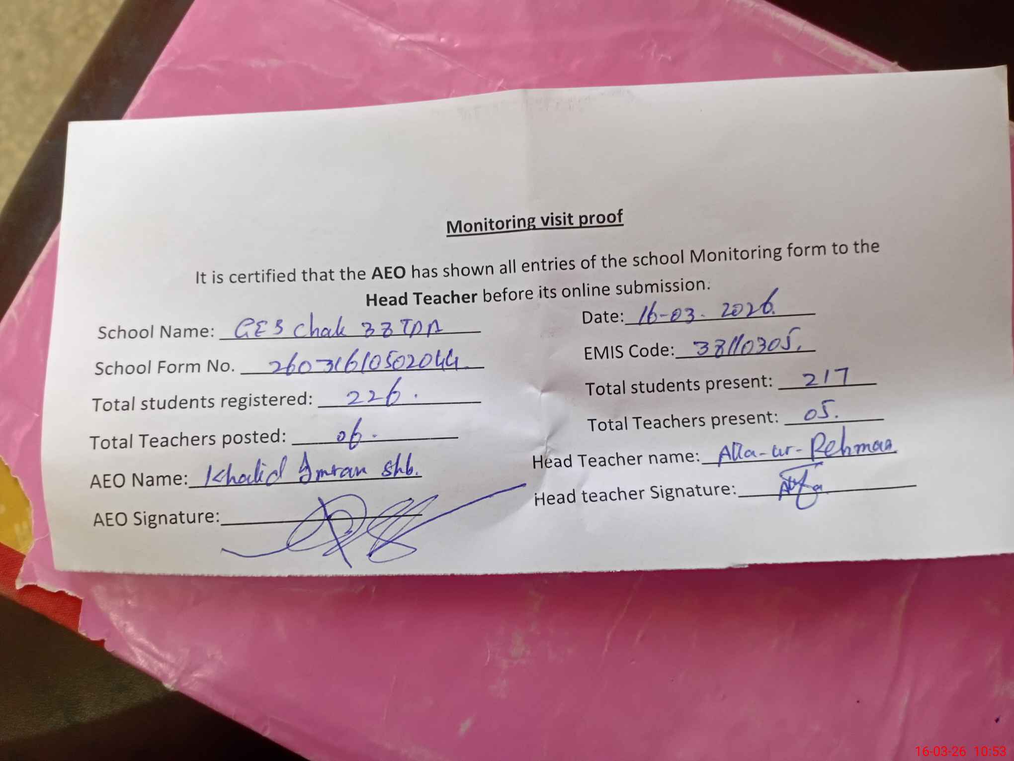 | Attendance Register | Head Teacher | MEA with School | Visit Proof |