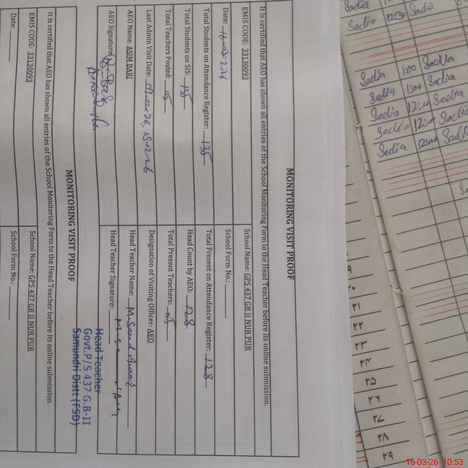 | EMIS Code: 33130093 | Name of School: GPS CHAK 437 GB N PUR SAMUNDRI | |||