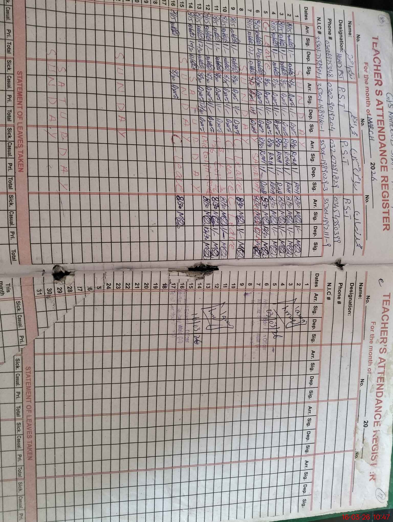 | Name: NA**** AK**** Designation: (School Headmaster's/Headmistress's) PST Phone/Cell Number: 03**** |