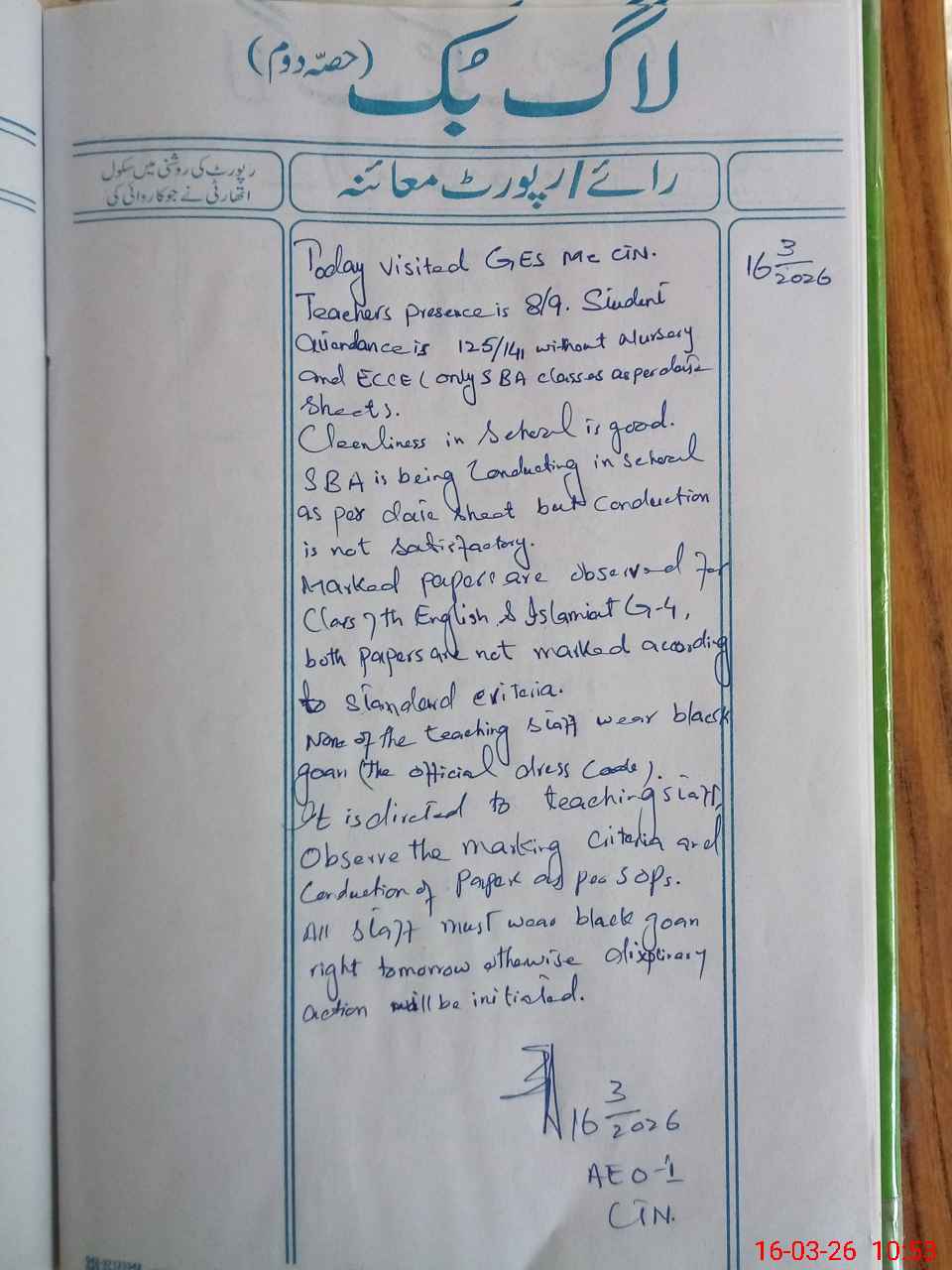 | Remarks (Use Separate Page if Required): The School is located in Mohajar Colony Tehsil Chishtian at Mc Chishtian place. Building repairment and whitewash is needed. | |||||