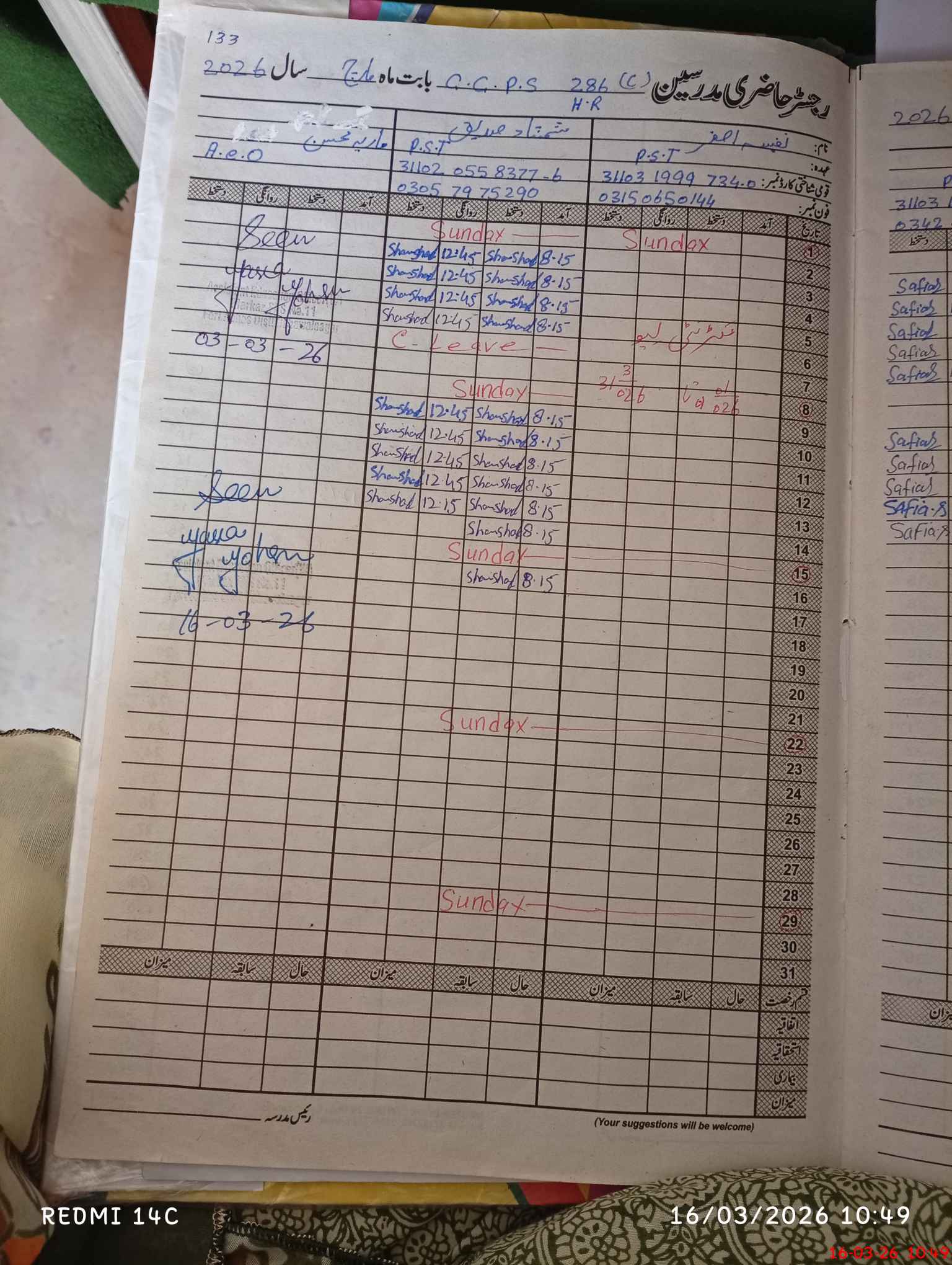 | CNIC | Full Name | Designation | R/C | Absence During Last Calender Month |