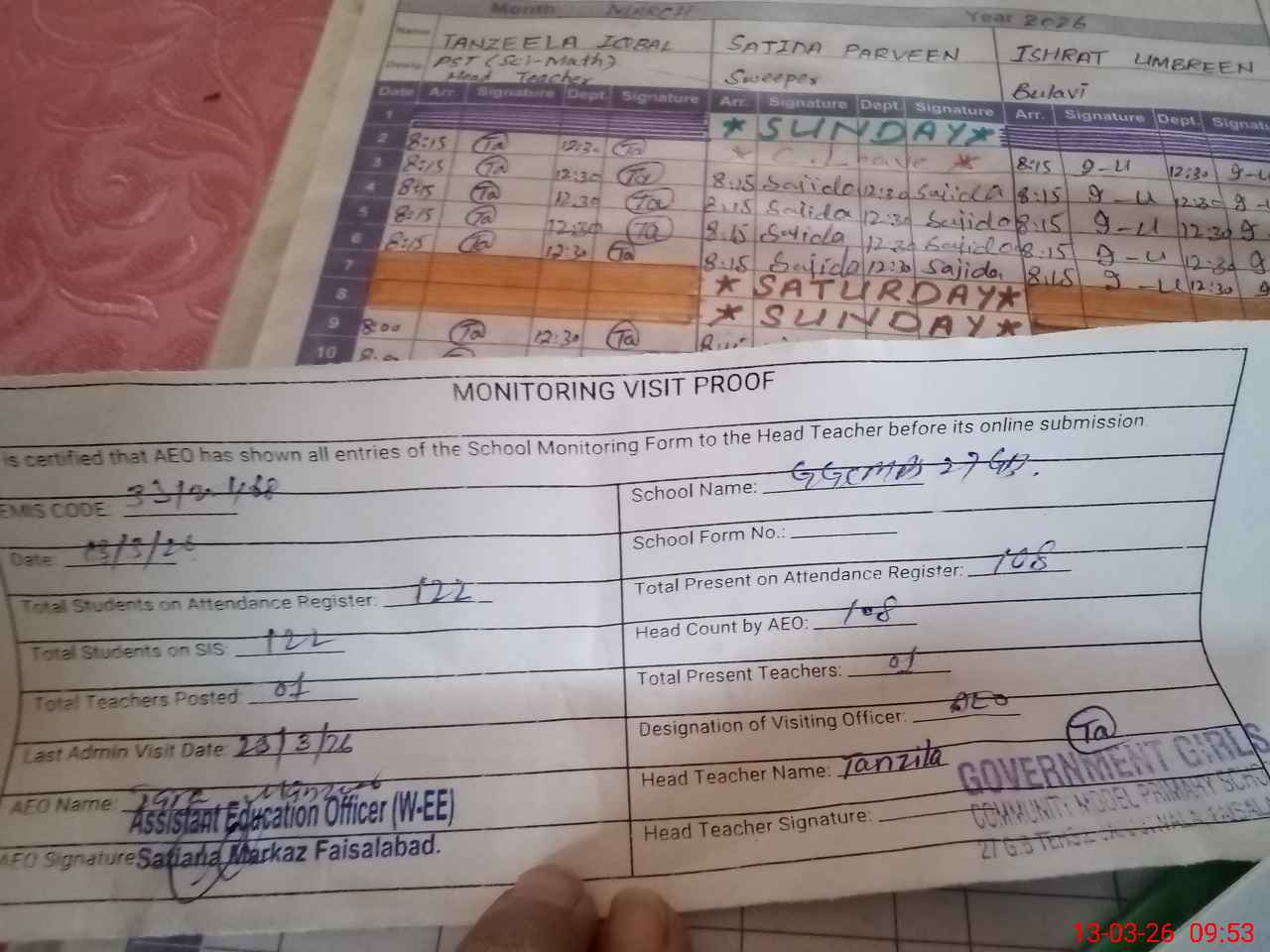 | Attendance Register | Head Teacher | MEA with School | Visit Proof |