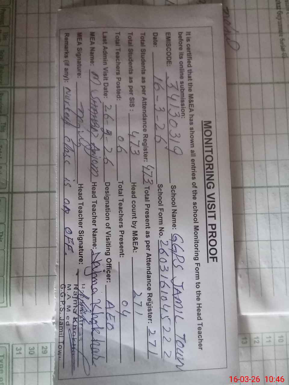 | Attendance Register | Head Teacher | MEA with School | Visit Proof |
