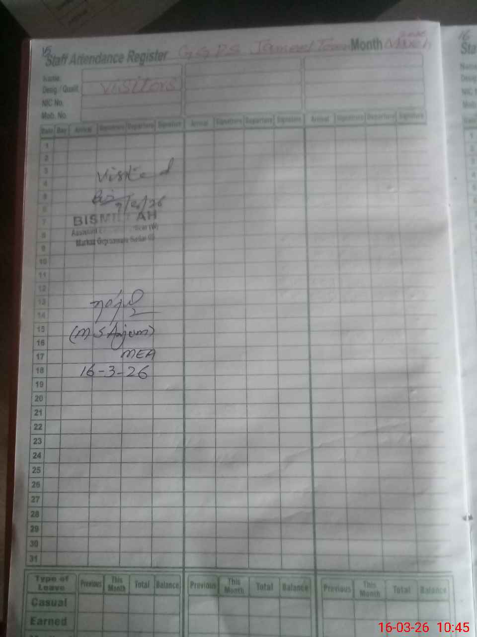 | CNIC | Full Name | Designation | R/C | Absence During Last Calender Month |