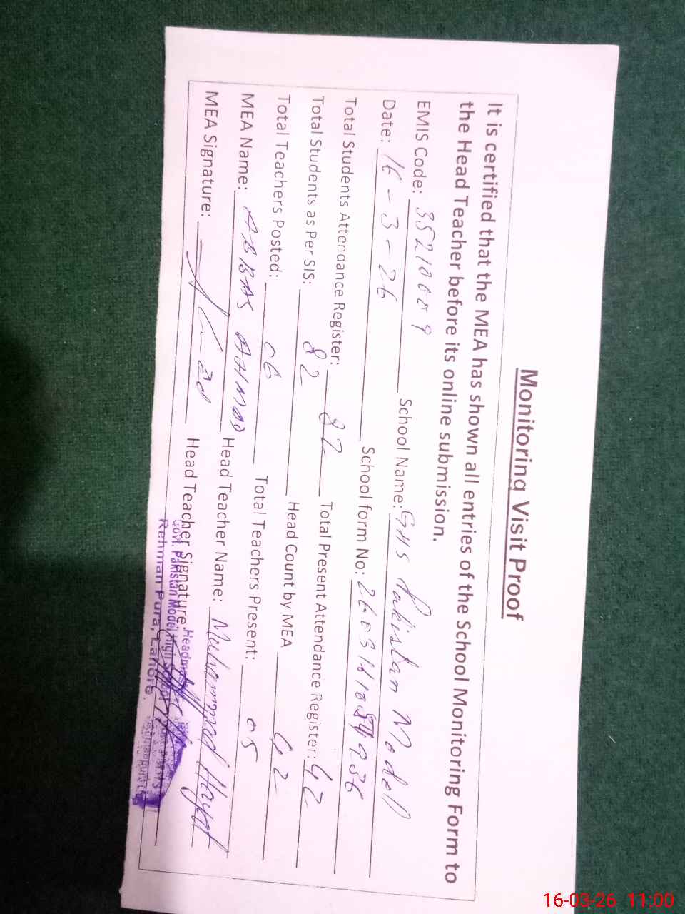 | Attendance Register | Head Teacher | MEA with School | Visit Proof |
